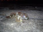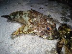 The Crab pot (collapsible net type hobby creel from ebay) and dropnet where baited with a punctured tuna tin. Crab pot went in first, while waiting I went to a shallower place with the drop net and let it down into about 1.5m of water. After about 30 seconds a lot of traffic could already be seen on the seafloor between crabs and prawn and something I couldnt make out but as soon as it was on the net I pulled it up and what a beautiful beast! A long Spined Scorpionfish. Its belly was all blue as around the mouth, just amazing.