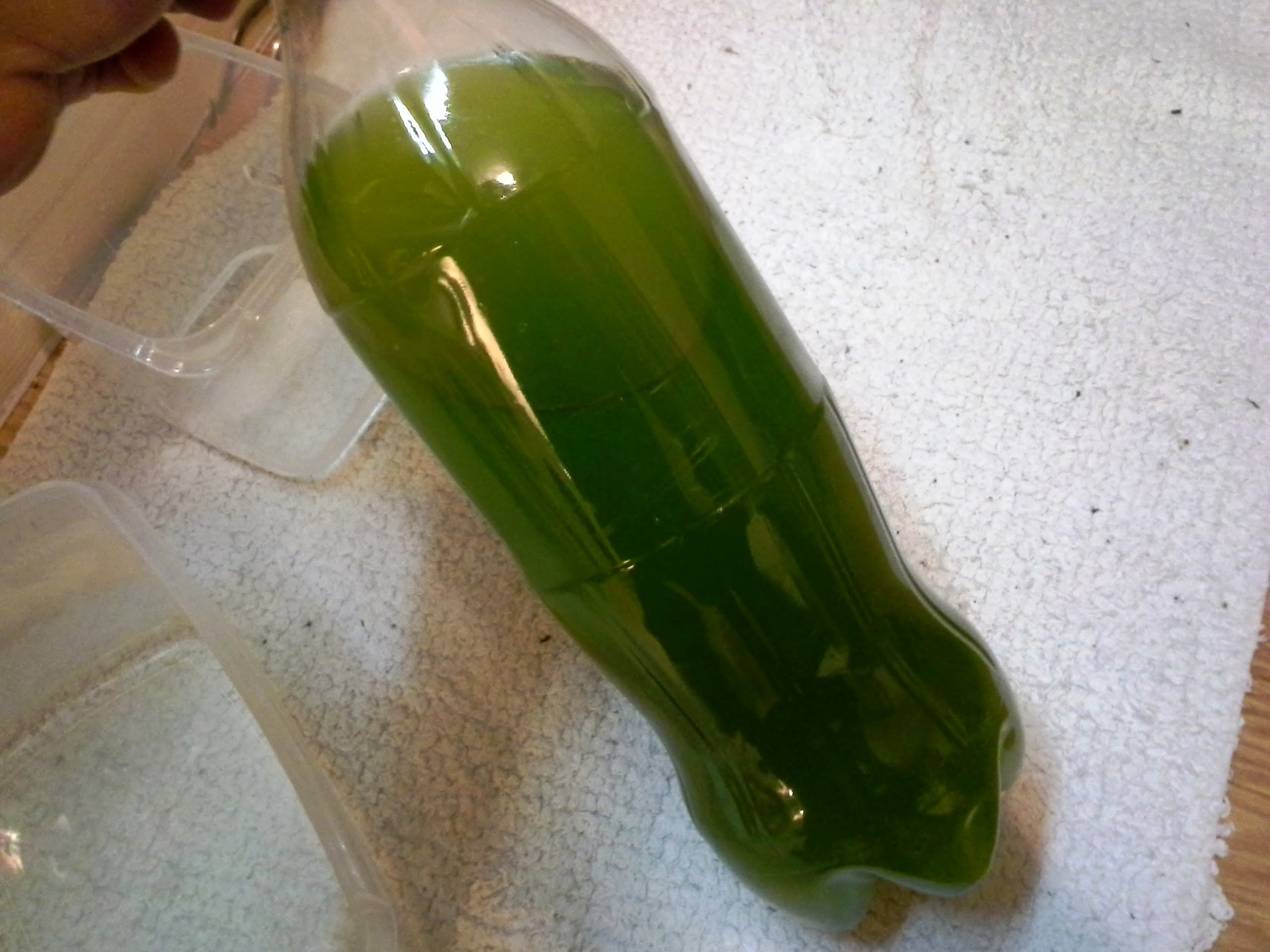 I could have stuck the light fitting into the lid but I was worried about the cardboard getting too hot and I wanted the light to sit between the bottles so I suspended it with a piece of galvanised wire. It couldnt be simpler. I actually didnt think its going to work as the light is just a standard warm white bulb 2500k rather than 6500k (daylight). Also when the light are ON the water in the bottles is probably around 27 degrees and at night (when lights are off) probably goes down to 18 so not very natural. Apparently the main thing is to give the bottles a good shake after every few days to ensure that the cells cant settle on top of each other and die and pollute the water. Surely you can understand my joy when the water was already fairly dark green after three days, I was so surprised it grows THAT quick. 🙂 After one week the two bottles went from practically clear to this…