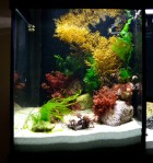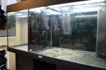 Basically how it works is as follows. My old tropical freshwater tank (Juwel Rio 180) got converted so I glued an acrylic partition to split it in two. Then I cut out an overflow section and a hole to drain it. The Partition splits the Tank in a 35cm section on the left and leaves a 65cm section to the right. The old internal filter in the RHS corner of the Rio is still in operation. A Tunze Skimmer 9004 is in the LHS corner of the 65cm section. A small pump 200lph (probably too small) pumps water from the RHS into the LHS. The water then overflows from the LHS to the RHS section. Basically its as if the RHS section is the sump of the LHS section. This allows me to have two tanks with only one skimmer etc. Here a few bad pictures of the build to make it more sense…