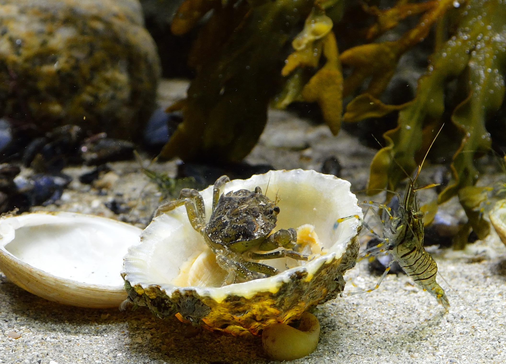 Here I put all the bigger hermits and prawns for the moment. Yesterday I was able to catch a shorecrab out of the maintank that came as a hitchhiker from the rocks, its now also in this section.
