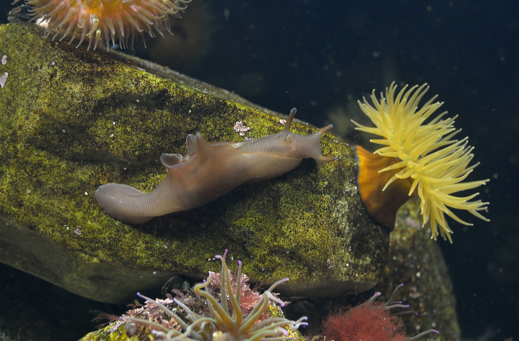 As the title gives away the two seahares have grown to real giants. They are now by far the biggest animals in the aquarium. From their former length of around 25mm they have now grown over 100mm! 🙂 They still graze very much to my joy on the red hairalgea that is plaguing the tank. The only macroalgea they have touched is the delesseria which was a nice 10cm bush, well it was gone in 30min of being introduced. They homed in on it and devoured it which of course was not very much to my liking, however they deserved the treat 😉 As said before I really enjoy watching snails or slugs in general as they plough majestically and seemingly unstoppable in a slow pace through the underwater world. since they have grown so much its much easier to see how they wrap their “lips” from left and right around a bunch of the hairalgea then rip it off and transport it to the mouth, very interesting to watch. Really like that shot…actually one of the “ears” got nipped off by a hermitcrab.