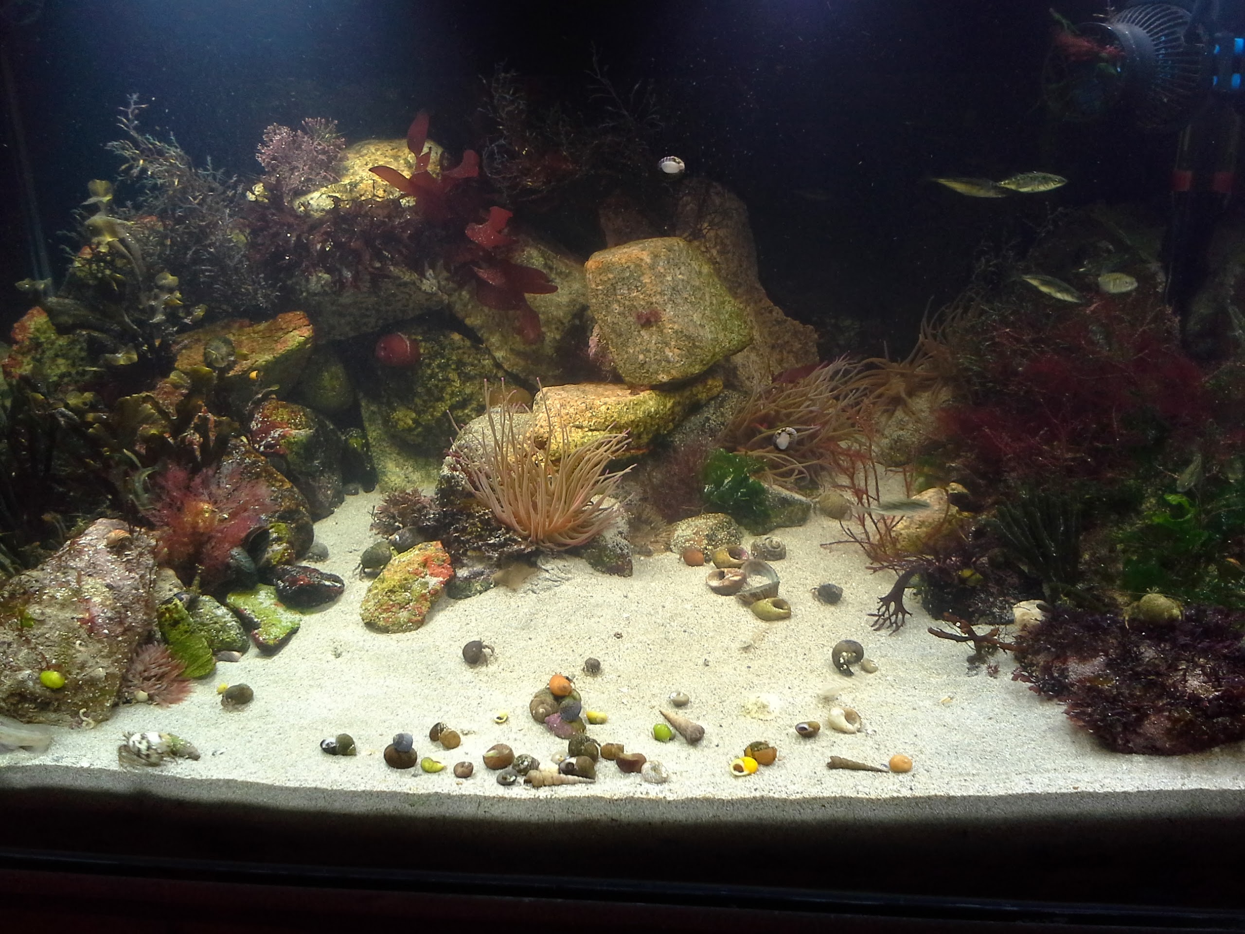 Obviously doesnt look as clean as the beginning but nice to see that some of the previously barren rocks are now hosting a few seaweeds. There has been some serious plaguing with cyanobacteria and epiphytes overgrowing seaweeds, rocks and some poor old snails. I suppose this is fairly normal and to be expect as even in real rockpools seaweeds have to battle with strong epiphyte growths especially throughout the summer. If I had the time I could probably do better in the fight against them with additives and certain filter media that would remove phosphates quicker as they could consume them. But I like to keep it simple and as natural as possible. I have however been experimenting with a “Macro Algea Fertiliser” called SeaGreen from Waterlife. I think it is helping the Brown Fan weed that is growing well since, however its hard to tell does it have to do with the reduced daylight and/or temperature. Water values have been perfect since the addition of the live rock to the sump a good few months ago. Ammonia, Nitrite, Nitrate and Phosphate all zero. I want to try and get the nitrates up a bit to hopefully improve macroalgea growth by feeding more often with blended shellfish etc. but thats only a plan so far. The last batch I made went bad when I had the power outage and the freezer unthawed.