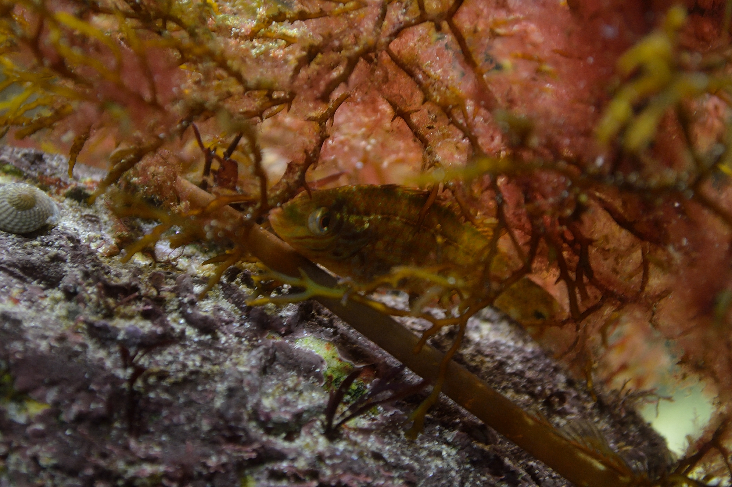 Its just for a trial. I was worried it cant cope with the flow but so far it seems very comfortable in the big bush of Rainbow Wrack. Saw it a few times nip at the weed so i hope its finding enough food. Otherwise it will be returned. Seems to be good Buddies with the smaller of the new two Corkwing Wrasses (25mm and 35mm)