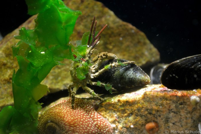 There isnt much going on but the Spider crab is doing well, here from a few months ago. Has shed about 3 times in the tank and taking fairly big leaps in growth everytime. Decorating itself with anything it can find!