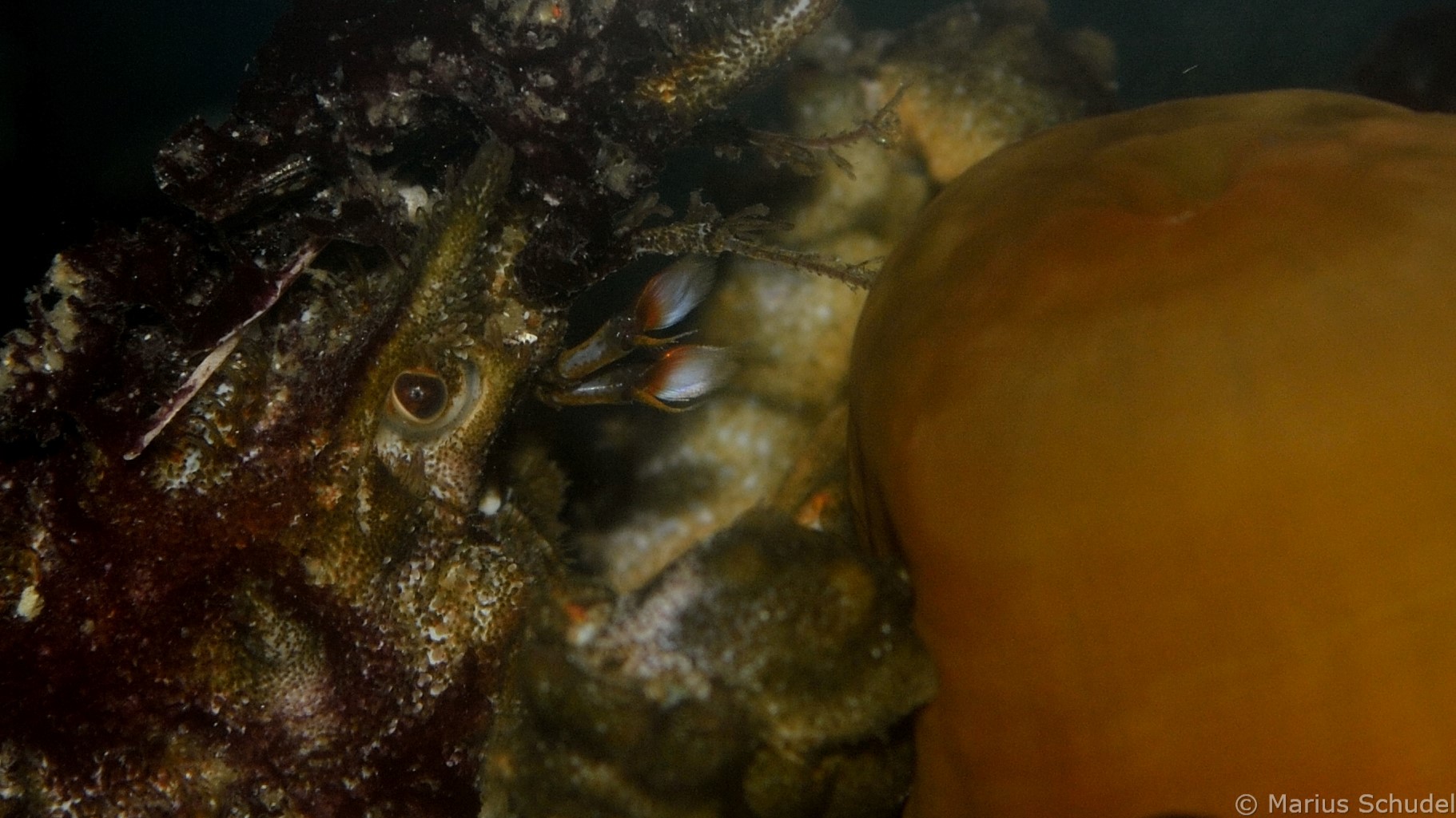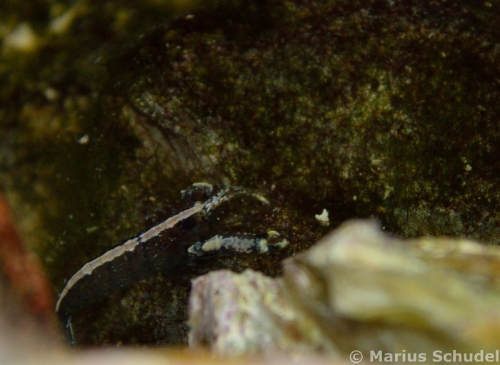 Another cool thing I accidentally caught with some mysis and completely overlooked for a good while. Some very unusual prawn that I never found in years of Rockpooling. I though it was a juvenile lobster or something much larger due to its claws, it was a mystery for a good while until I spotted the female carrrying eggs which obviously meant that these are fully grown. So I went through the books and it seems to be Athanas nitenscens but I am not 100% sure though the white line on the back is a bit of a giveaway and the fact that the book describes them to “resemble small lobsters”. Which explains our earlier theories π They are very shy and really hard to get a clean straight shot done but really cool to watch the male and its little mini claws.
